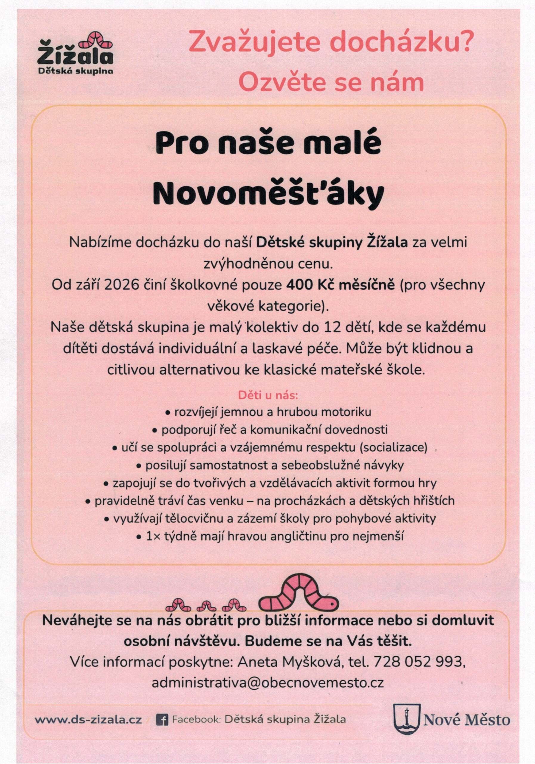 Oznámení pro malé novoměšťáky-zvýhodněná cena školkovného od září 202